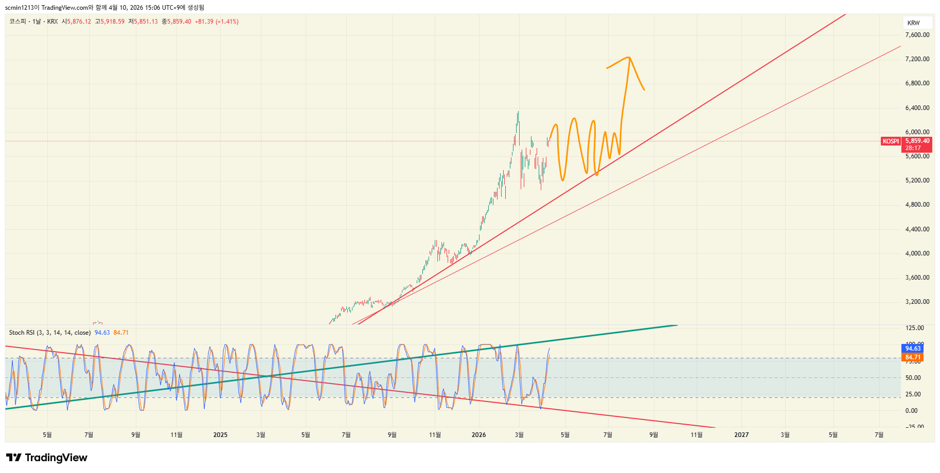 다른거 다 없이 딱 rsi 지표 상태 보고 빨간선 그음 그리고 추세 각도 올라가는거 보면서 굵은 빨간선 그어놓음