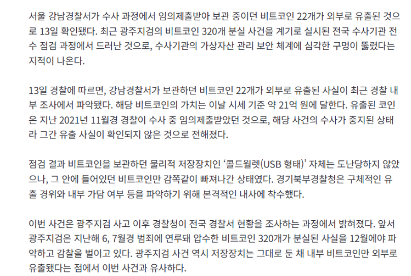 [단독]강남경찰서, 보관 중이던 비트코인 22개 증발… 21억 원 규모