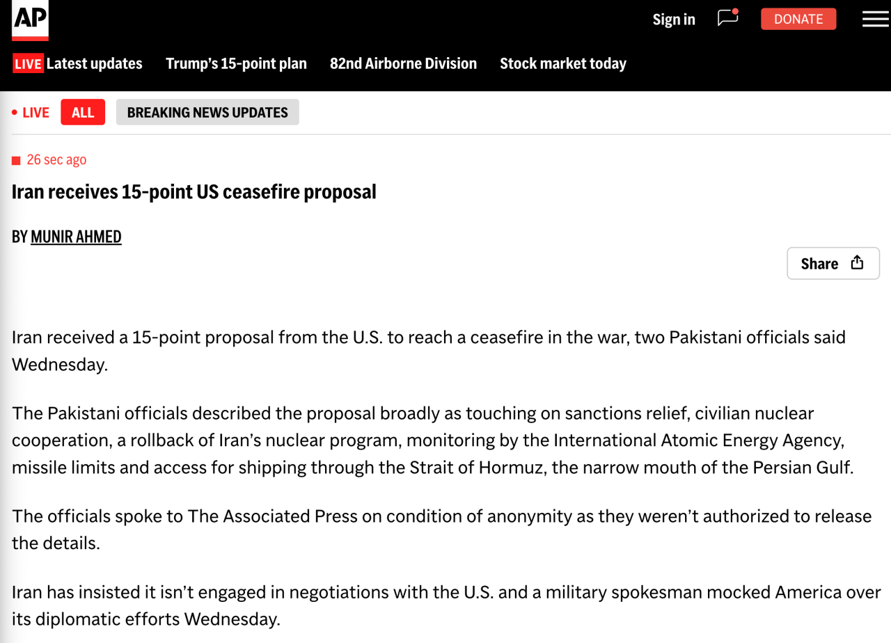 파키스탄 관료들에 따르면 미국이 이란에 15개 조항의 휴전 제안서를 전달했다고 한다. 제안 내용에는 이란 제재 완화, 민간 핵 협력, 핵 프로그램 축소, IAEA 검증, 미사일 제한, 호르무즈 해협 통행 보장이 담겨있다.하지만 이란은 미국과의 협상이 없다고 부정하고 있고, 이란 군 대변인도 미국의 외교 노력을 조롱했다.