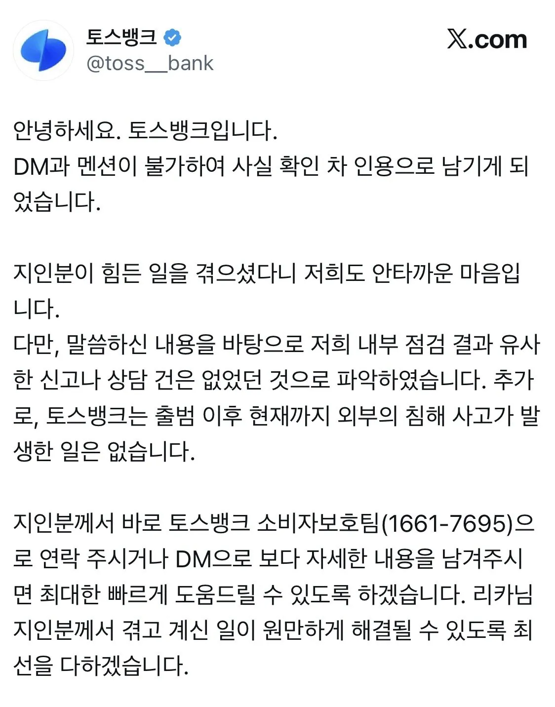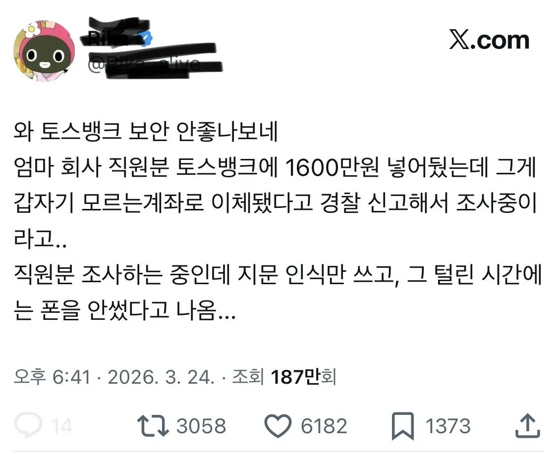 헐 100만 뷰를 받은 글이 있대토스뱅크 보안 터졌다는 폭로글임근데 토스뱅크에선 뭐라고'그딴 건 없는데요?'