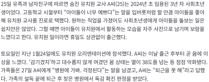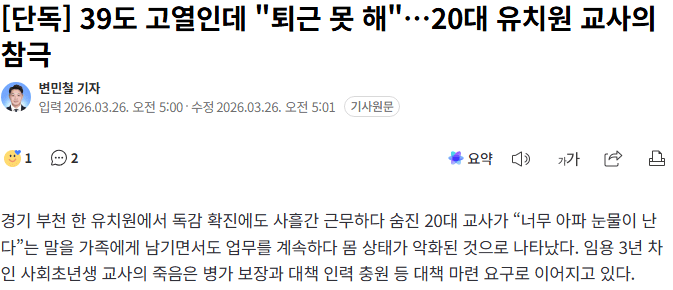 20대 교사가 심한 고열로 힘들어하고 있는데 원장이 퇴근을 허락하지 않았다고 한다. 아이들을 돌봐야 한다는 이유로 병들어도 자리를 비울 수 없다는 현실이 정말 안타깝다. 이런 상황이 반복되면 교사의 건강은 어떻게 되는 걸까.