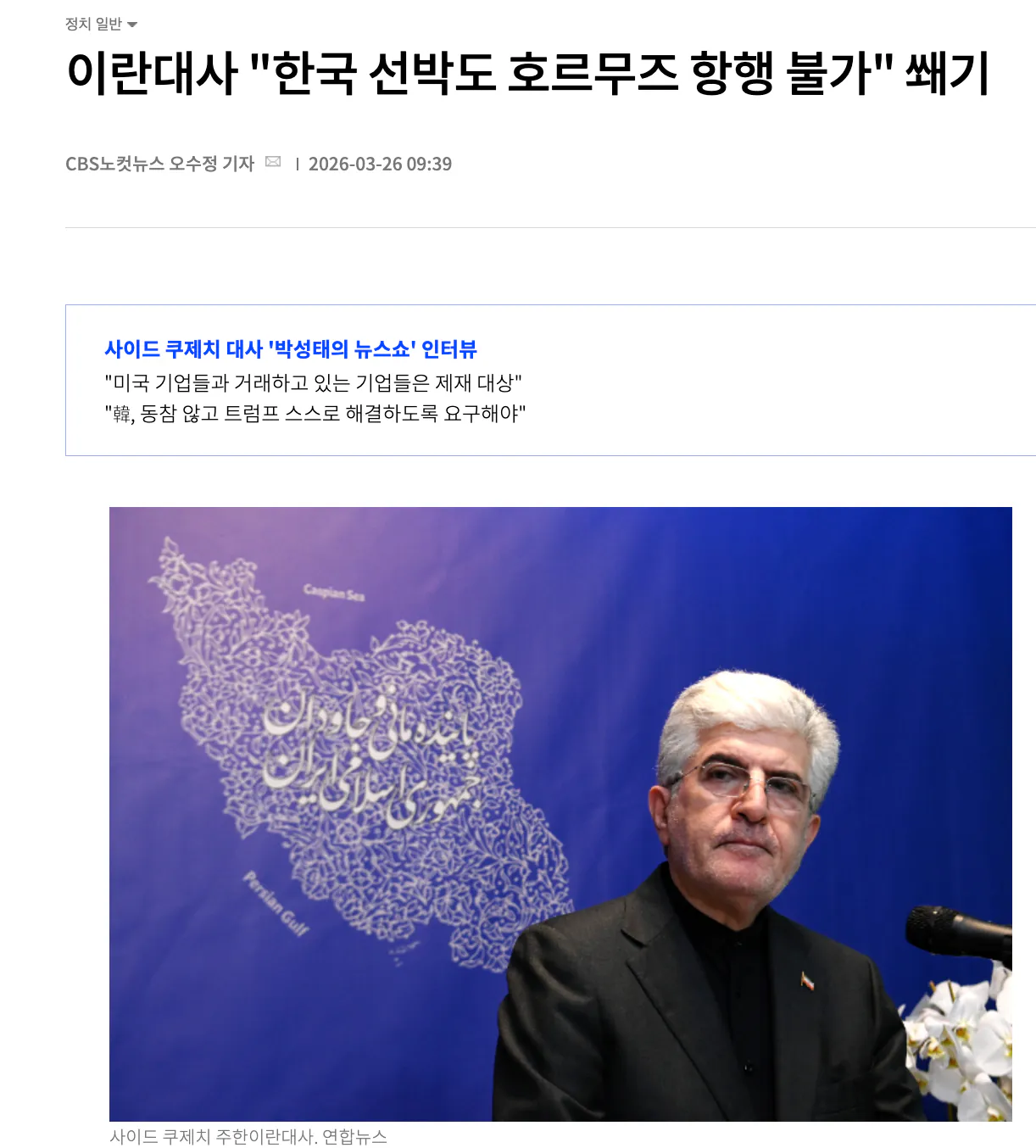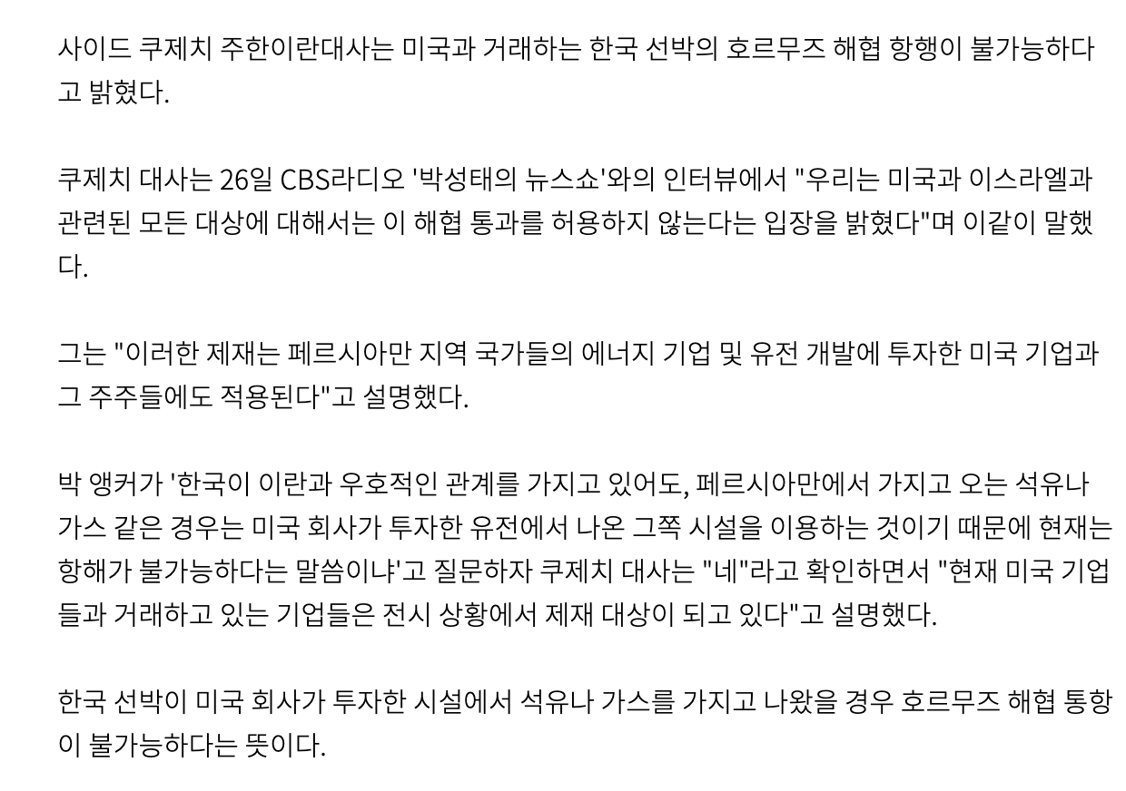 이란대사 "한국 선박도 호르무즈 항행 불가" 쐐기
