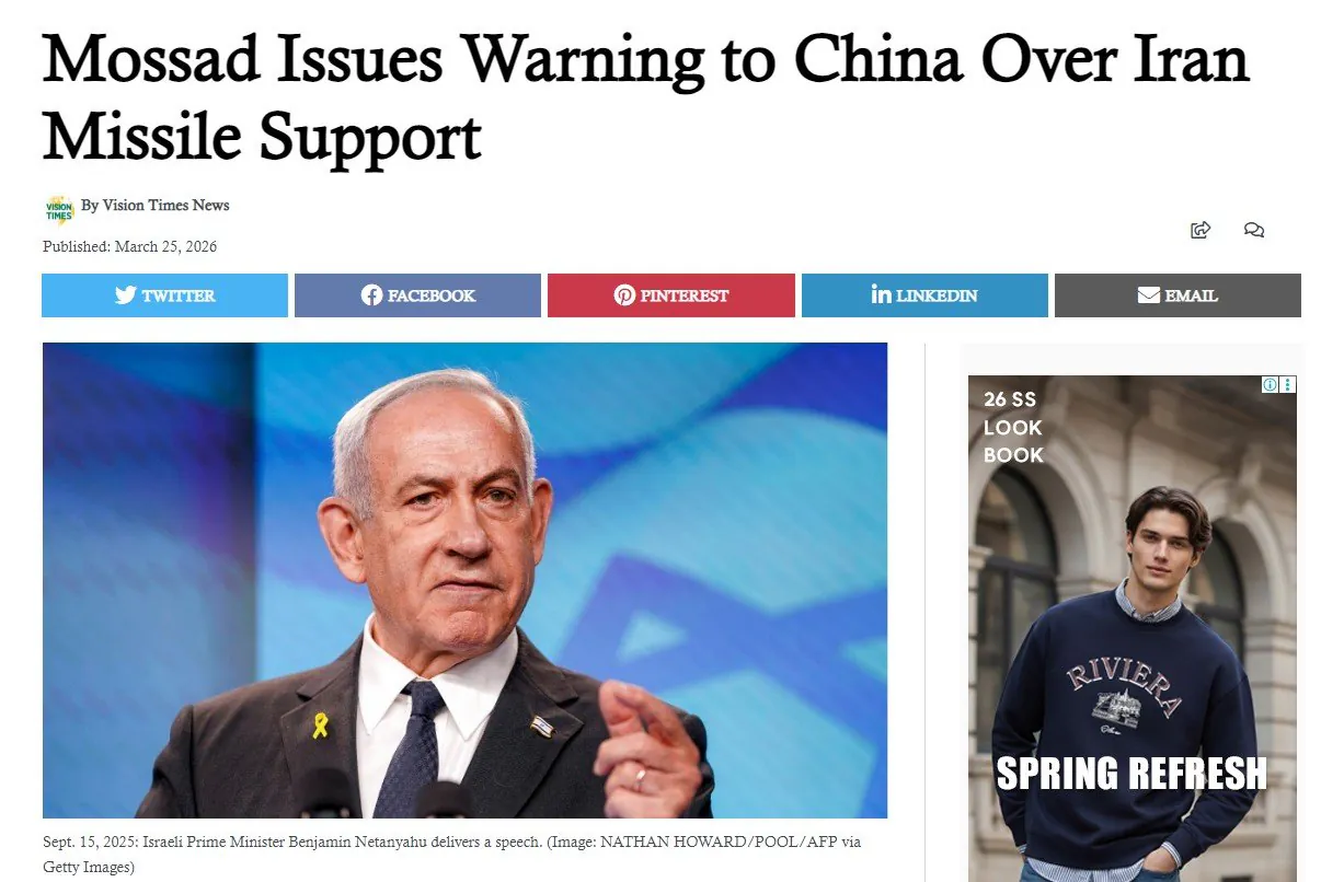 모사드가 25일 공식 성명을 통해 중국이 이란으로 미사일을 보내려는 움직임을 적발했다고 밝혔음. 관련 기관은 이 상황을 매우 심각하게 보고 있으며, 강력한 경고를 함께 발표했다고 전해짐.