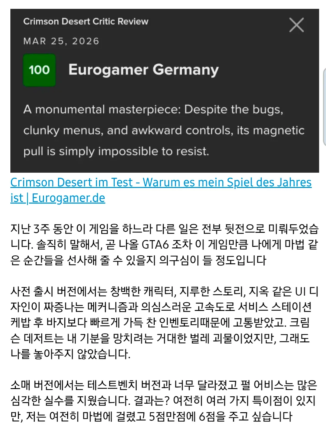 게이머가 붉은사막을 평가하지 못하고 있었다. 최고의 경험과 최악의 경험이 함께 녹아있는 작품이었기 때문이다.