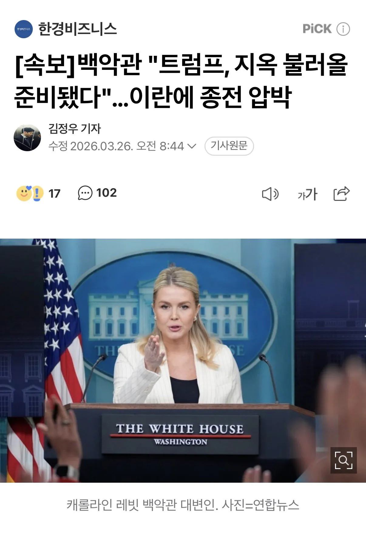 트럼프 대통령의 백악관 대변인 캐롤라인 레빗이 이란을 상대로 강한 입장을 드러냈다. 현재 제시된 협상안을 받아들이지 않으면 심각한 결과가 초래될 것이라 경고한 것이다. 협상 수용을 최후의 통첩 수준으로 촉구하는 발언이다.