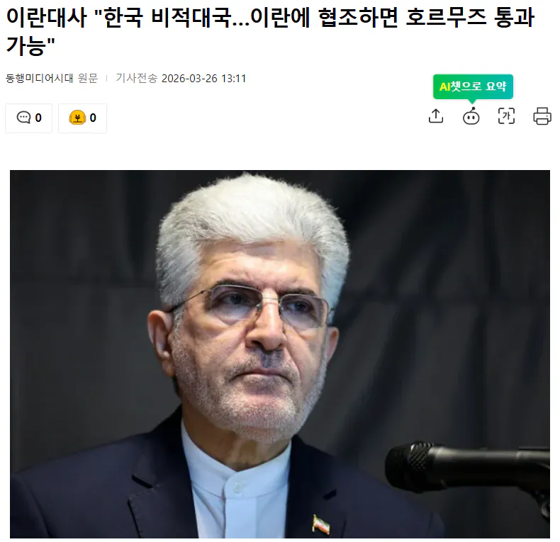 이란이 한국한테 호의적이네... 호르무즈 통과도 봐주나?