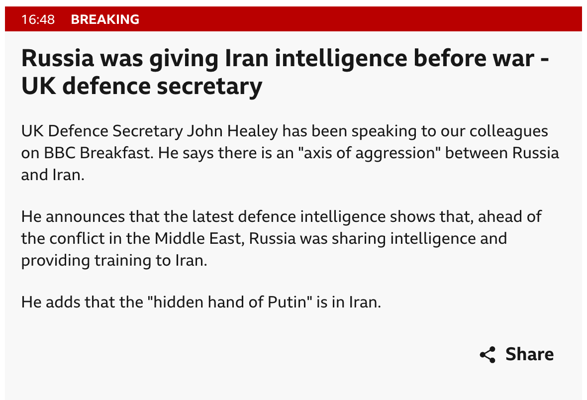 영국의 존 힐리 국방장관이 BBC와의 인터뷰를 통해 러시아와 이란 사이의 밀접한 협력 관계를 공개했다.국방부 정보 분석에 따르면, 최근 중동 충돌이 일어나기 전부터 러시아가 이란에 각종 정보를 제공하고 군사 훈련까지 지원했다는 것이다.힐리 장관은 현재 이란 내에서 러시아의 영향력이 작동하고 있으며, 이는 러시아가 중동 정세에 개입하려는 의도로 해석된다고 설명했다.
