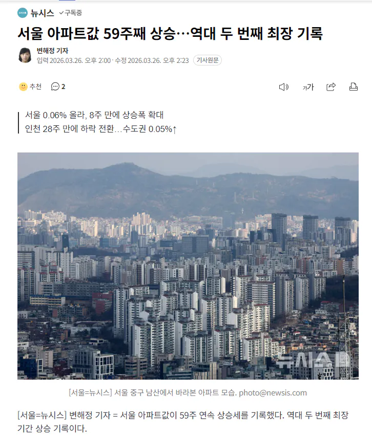 서울 아파트값 59주째 상승…역대 두 번째 최...