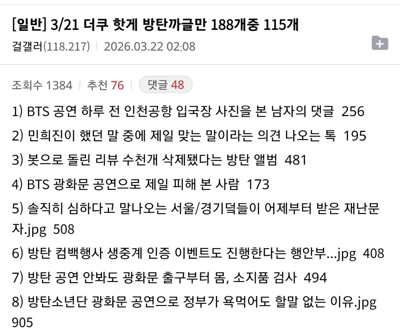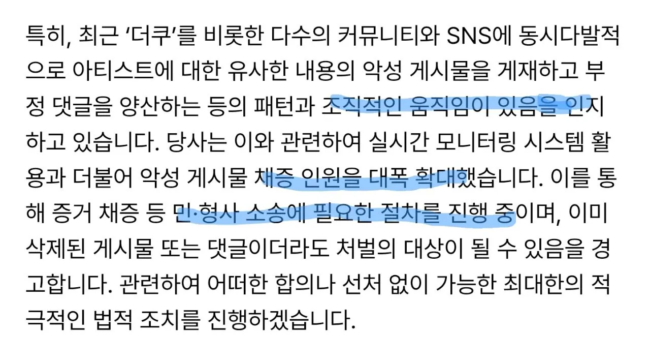 체계적으로 진행 중이며 증거 수집 인원도 계속 늘리는 상태라고 함. 지워진 글이라도 이미 다 기록해뒀다니까 삭제는 의미가 없다는 평. 광화문 공연 당시 더쿠 핫게에 올라온 188개 게시물 중 115개가 방탄 비판글이었다고 하는데, 그 정도면 정말 조직적이었다는 거네