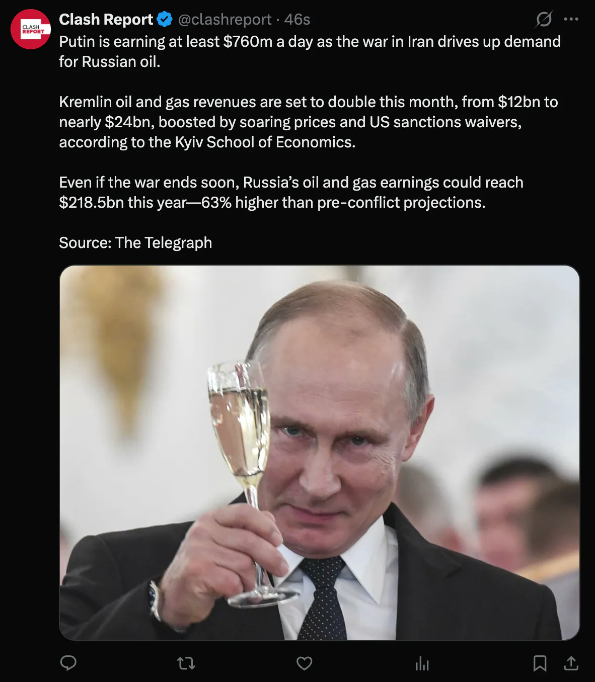이란 전쟁 때문에 러시아 원유 수요가 폭발했다더라. 푸틴이 하루에 7억 6천만 달러(약 1조 원)씩 챙기고 있다고.유가 올라가고 미국도 제재를 일부 풀어주면서 러시아의 석유·가스 매출이 급증했다. 지난달 120억 달러 수준에서 이달엔 240억 달러까지 갈 거라고 본다.전쟁이 지금 끝나도 올해 러시아의 석유·가스 매출은 294조 원대에 도달할 거라고 한다. 전쟁 이전 예상보다 무려 63% 높은 수준이라고.