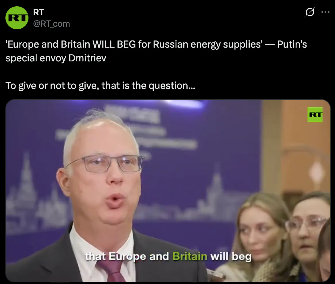 드미트리예프 푸틴 특사의 발언이 나왔다. 러시아의 전망으로는 앞으로의 상황이 분명하다고 한다. 유럽과 영국이 에너지를 놓고 러시아한테 구걸할 수밖에 없을 거라는 뜻이다.그럼 러시아는 그때 제공할지 말지를 자유롭게 결정하겠다는 입장을 드러낸 것이다.
