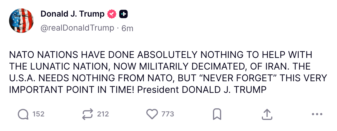 나토 회원국들이 군사적으로 박살난 이란 상황 앞에서 정말 아무것도 안 해줬대요. 미국은 사실 나토한테 뭔가 받을 생각을 처음부터 안 했지만, 이번만큼은 절대 까먹으면 안 될 일이라고 언급했습니다. - 트럼프 대통령아 이게 뭔가 좀...