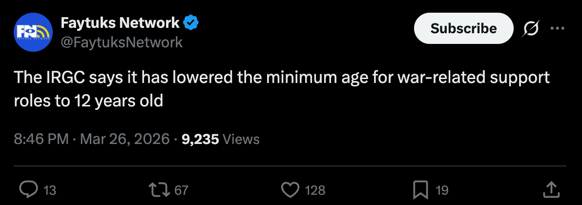 이란 혁명수비대(IRGC)가 전쟁 관련 지원 활동의 최소 참여 연령을 12세로 조정했다고 밝혔습니다.
