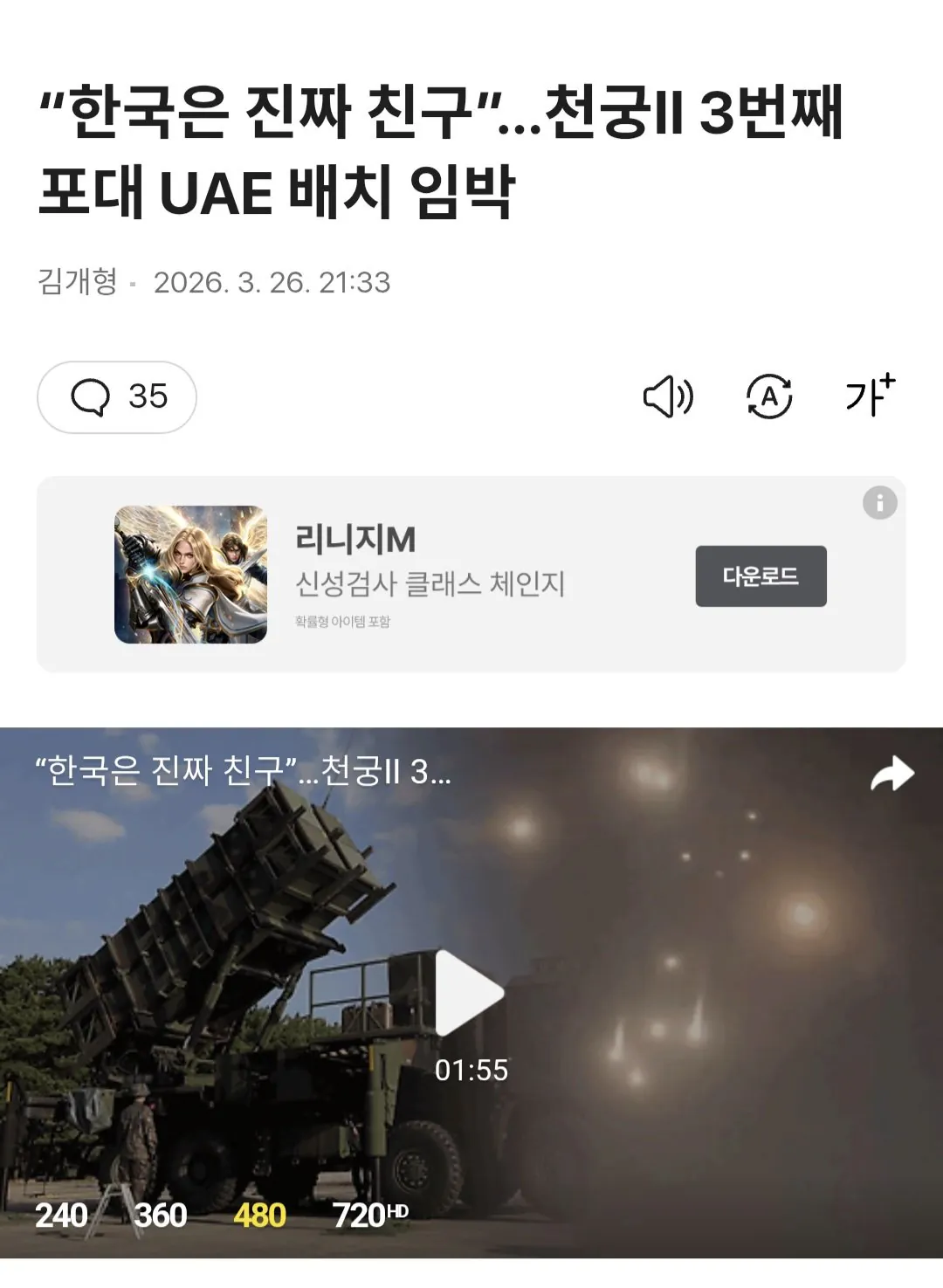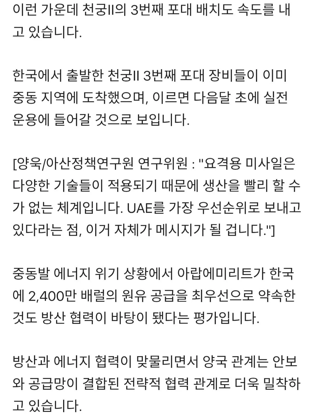 한국의 천궁2 방공체계 3번째 포대가 이미 UAE에 도착했다고 함. 다음 달 초부터 본격적으로 운영 시작 예정이라는 소식. 무기 지원에 감사함을 표하면서, 추가로 유류 같은 소모품 지원도 바라는 분위기