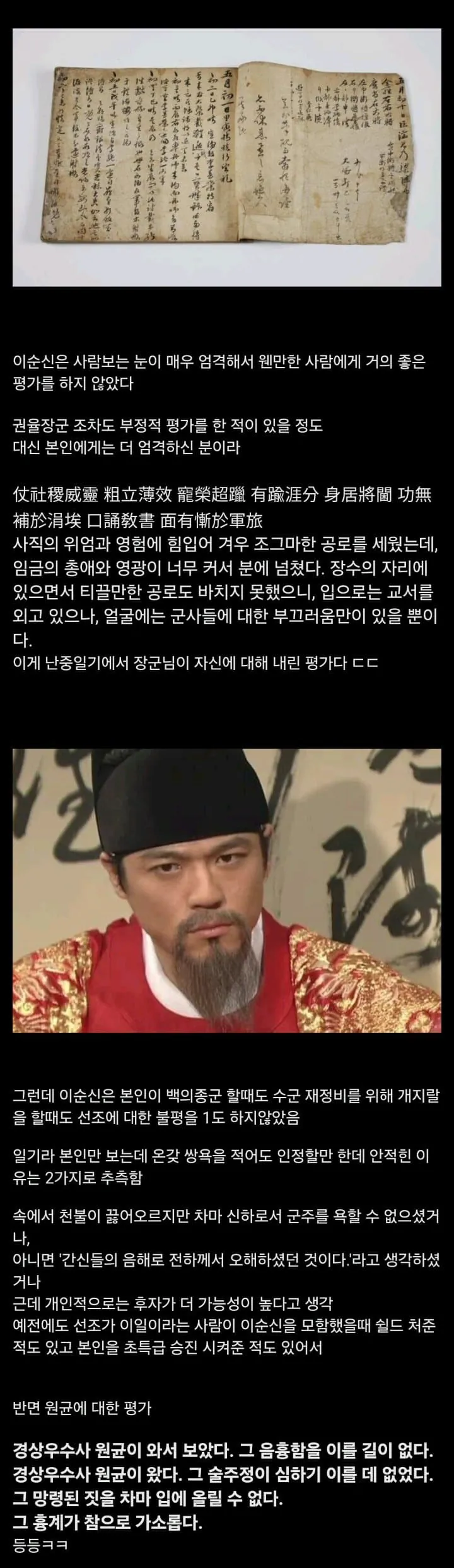 이순신의 일기를 살펴보면 원균이라는 이름이 무려 120회나 기록되어 있다고 한다.특히 계사년(49회)과 갑오년(46회) 시기에 집중되어 나타나는데,대부분 원균의 부끄러운 행동과 치졸한 모습을 질타하는 내용들이었다고 전해진다.