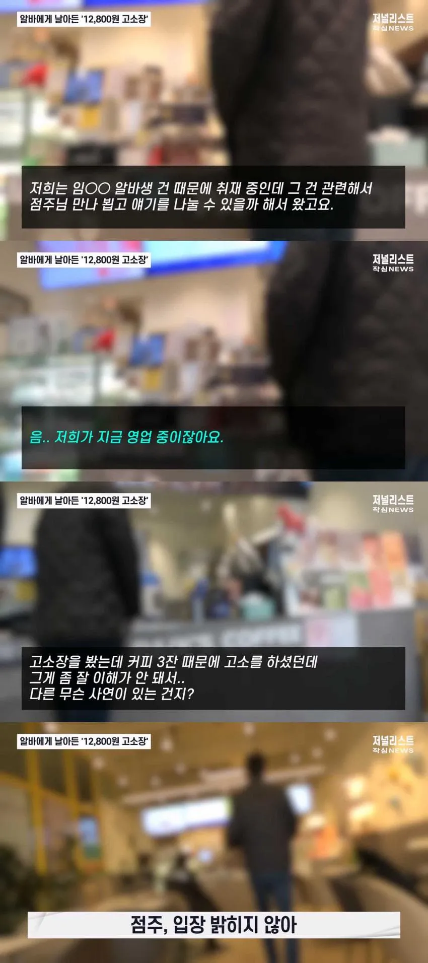 이것이 처음 겪은 일은 아니었다. 이전에 다니던 다른 커피숍 점주도 같은 식으로 압박했다. 수능 한 달 앞둔 시점에 점주는 쿠폰 부정 적립, 현금 절도, 무단 음료 취식을 의심하며 의혹을 제기했다. 공포에 질린 알바는 부모님 몰래 550만 원을 합의금으로 지불했다. 이는 5개월간 일해서 받은 총급여 약 298만 원보다 훨씬 큰 액수였다.