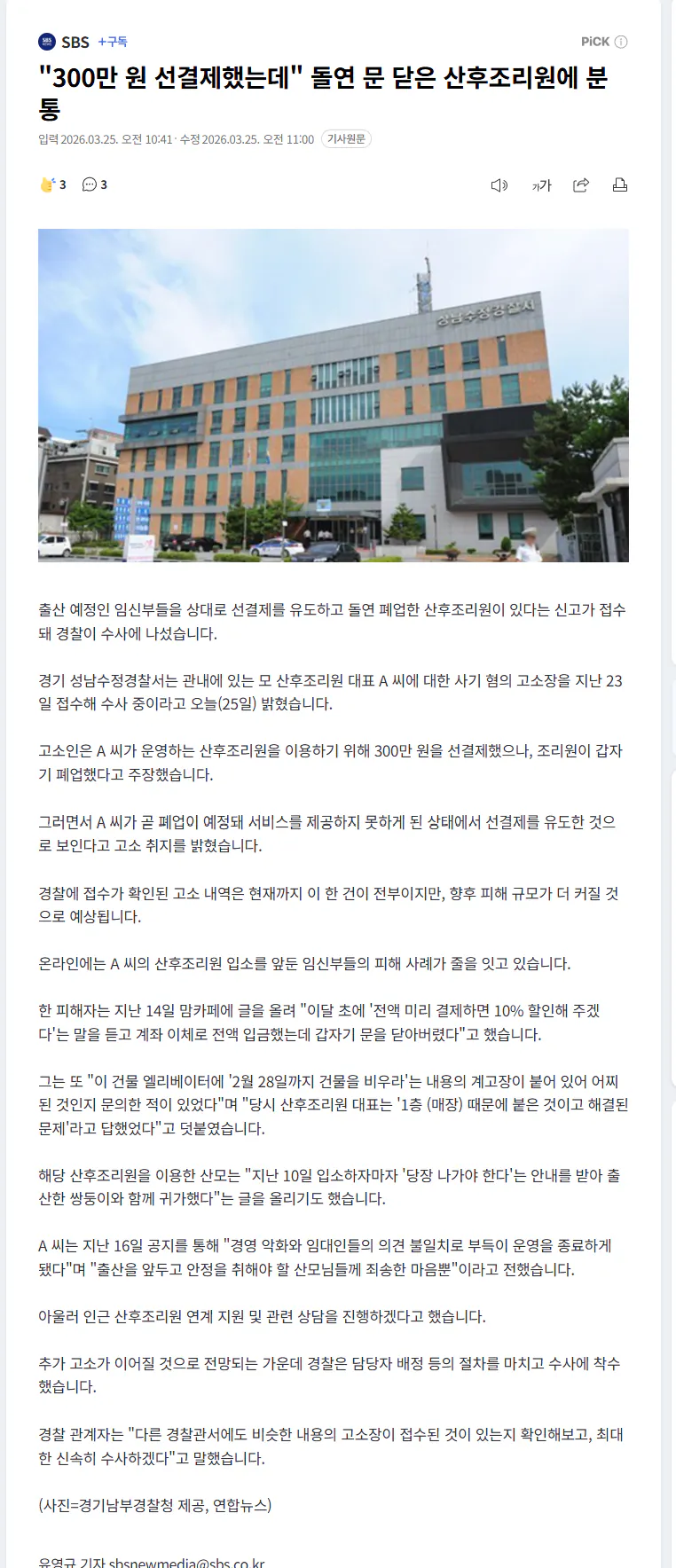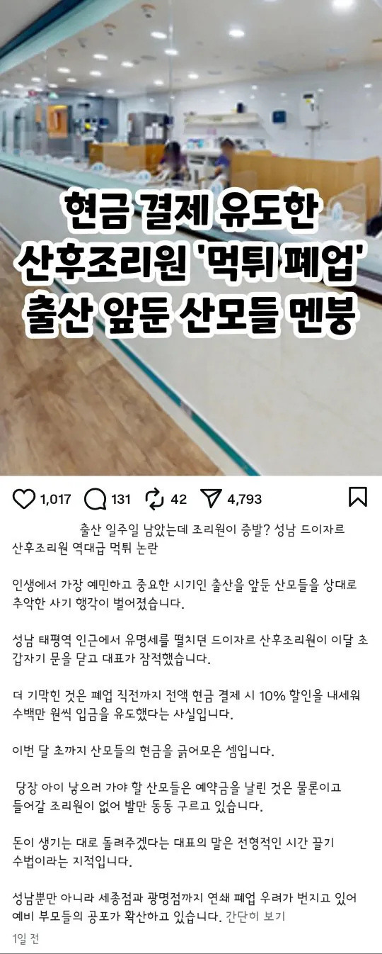 산후조리원을 운영하던 성남의 한 원장이 미리 받은 돈을 챙기고 폐업해 버렸다는 제보가 나왔다. 통상적으로는 예약금만 먼저 납부하고 실제 이용 시점에 잔금을 결제하는 것이 관례인데, 이 원장은 현금결제를 자꾸만 권하면서 10% 할인을 명목으로 전액 선결제를 받았다고 한다. 그 이후 원장은 시설을 폐쇄하고 자취를 감췄다. 피해자들이 이용하는 맘카페에 올라온 증언들을 보면, 원장이 계속해서 환불해주겠다는 말은 하고 있지만 실제로 돈을 받은 사람은 찾아볼 수 없다는 것이다.