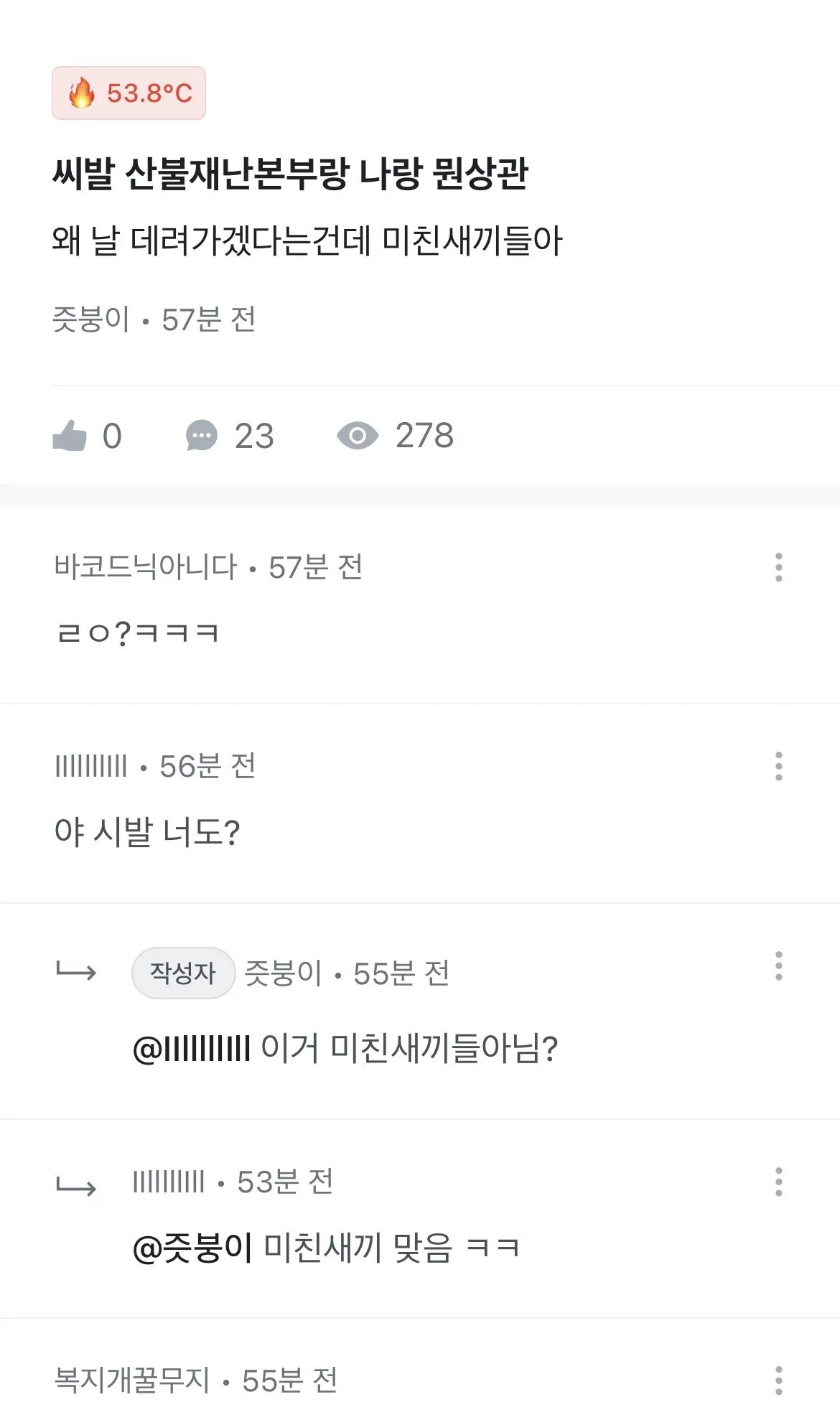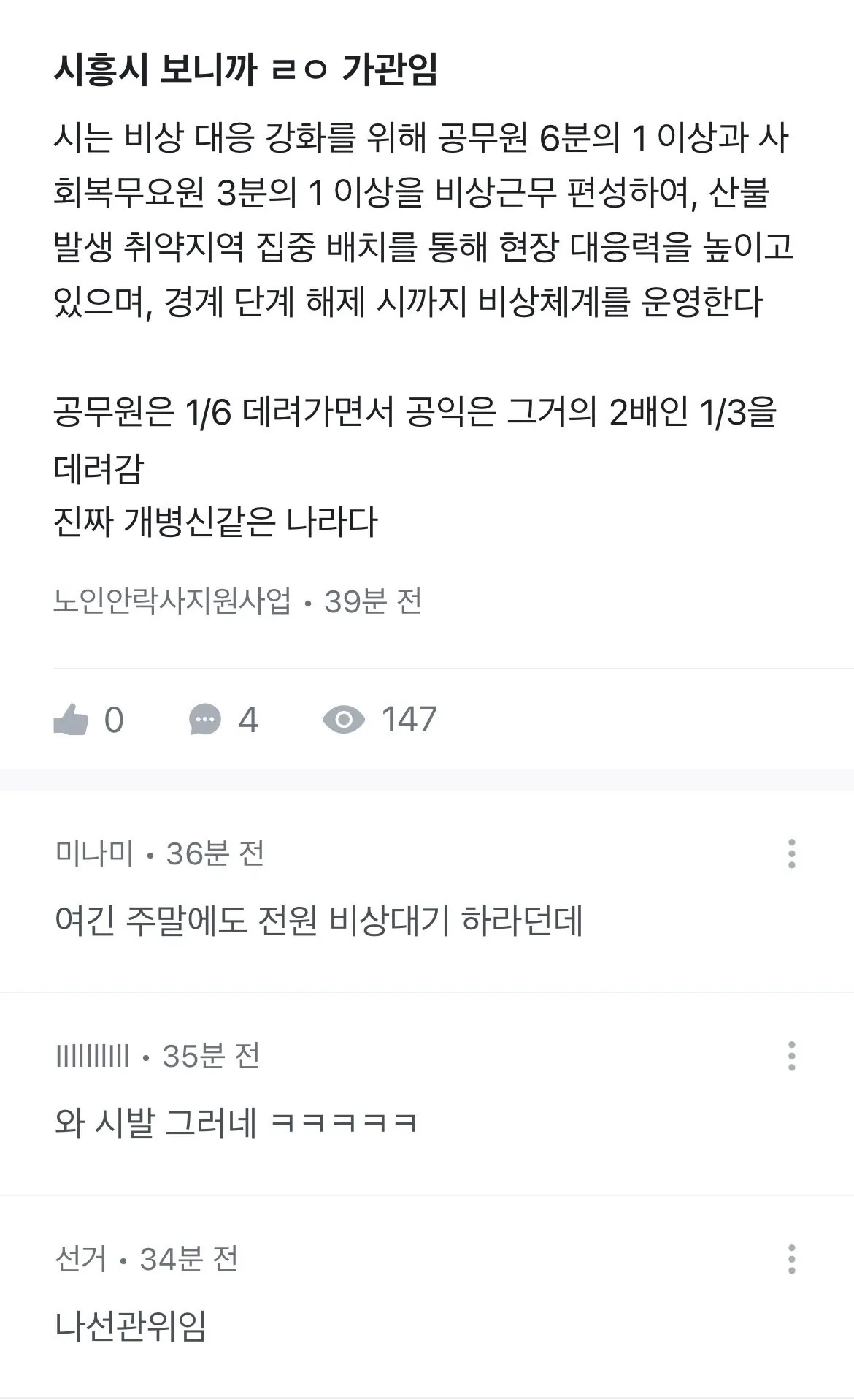 산불 대응 비상근무 편성할 때 공익까지 동원하기로 했대서 공익 커뮤니티가 발칵 뒤집혔음공무원은 6명 중 1명만 나가는데 공익은 3명 중 1명씩 끌고 가려고 한다더라