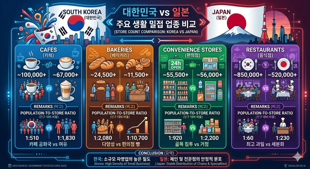숫자를 보면 한국의 구조적 문제가 드러남 일본은 1억 2천만 인구에 자영업자 650만 한국은 5천만 인구에 자영업자 560만 인구 대비 자영업자 밀도가 훨씬 높다는 뜻 이렇게 많은 자영업자들이 같은 파이를 나눠 먹으니까 당연히 경쟁만 심해짐 결국 뭘 해도 상황 개선이 어려움 해결책이라곤 관광 수요가 폭발적으로 늘어나서 시장 자체가 커지는 것 정도 예를 들어 매년 1억 명 이상의 관광객이 들어온다면 상황이 달라질 수 있지만 현실적으론 그런 일이 일어나기 어려워서 근본적 개선은 힘들어 보임