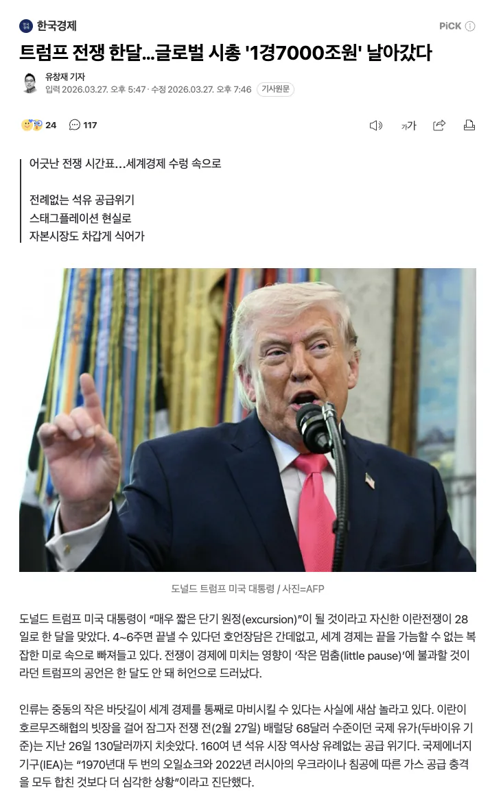 트럼프 전쟁 한달... 글로벌 시총 '1경 7000조원' 날아갔다