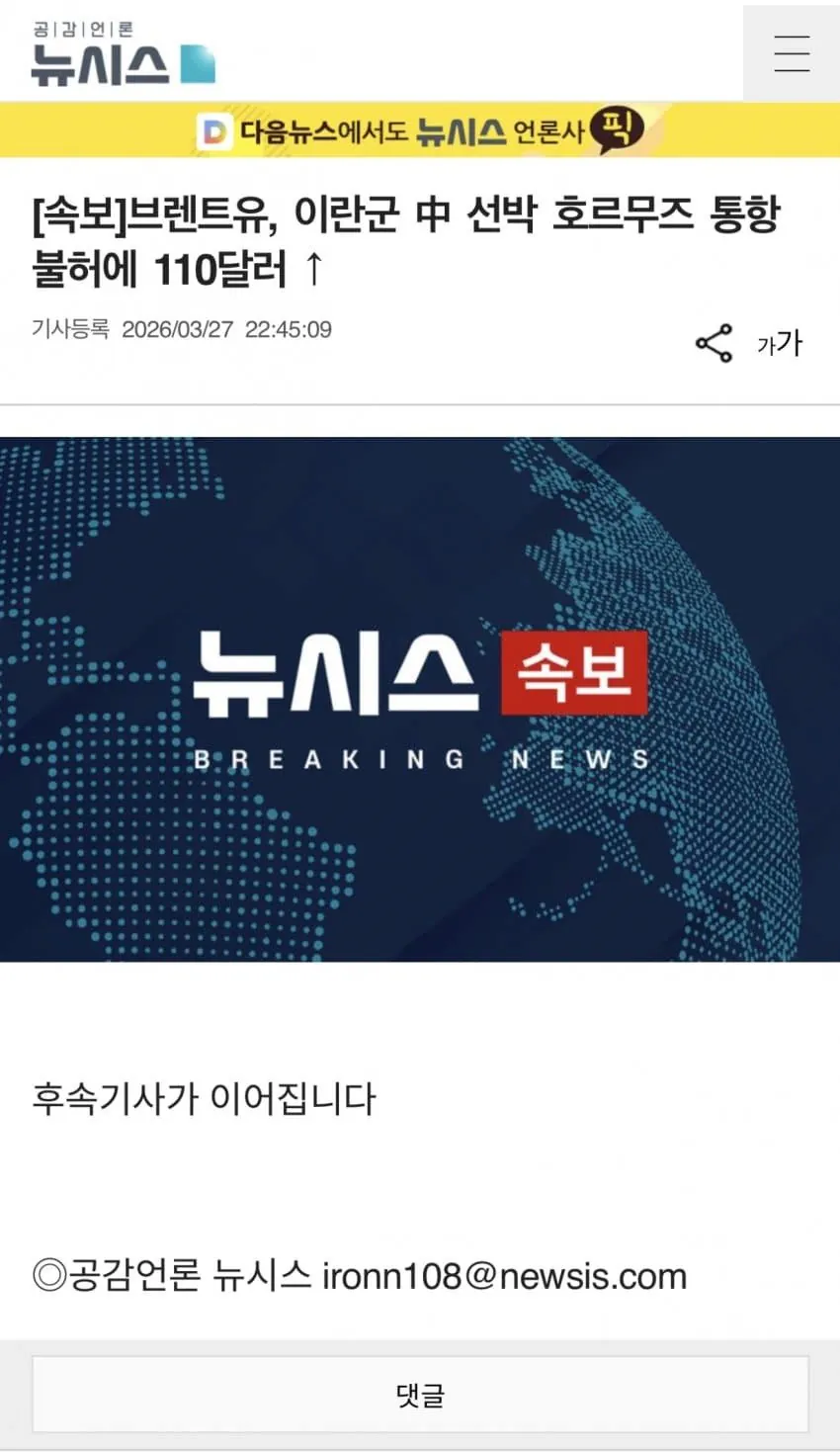 중국 배 호르무즈 통항 불허래, 그래서 유가 110달러 넘음