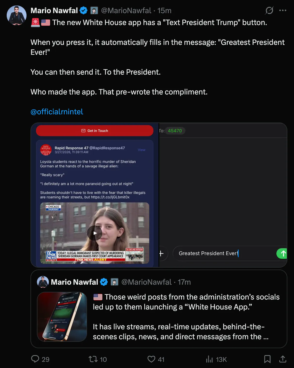 요새 나온 백악관 모바일 앱을 둘러봤는데 좀 신기한 기능이 있더라고요.대통령에게 직접 메시지를 보낼 수 있는 버튼이 있거든요.근데 이 버튼을 누르면 이미 메시지창에 문구가 자동으로 입력돼 있어요. '역대 최고의 대통령!'이라는 내용이죠.당연히 사용자가 직접 글을 쓸 수도 있지만, 기본값으로 이 찬양 메시지가 떠있다고 합니다.결국 본인이 직접 만든 앱에 본인을 칭찬하는 글을 미리 넣어둔 거네요. 뭔가 좀 웃기지 않나요?