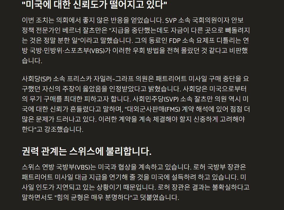 그런데 미국 입장에서는 이게 맞지 않았나봐. 스위스가 F-35 전투기 구매용으로 예약해둔 자금에서 패트리어트 미사일값을 그냥 빼버림ㅋㅋ