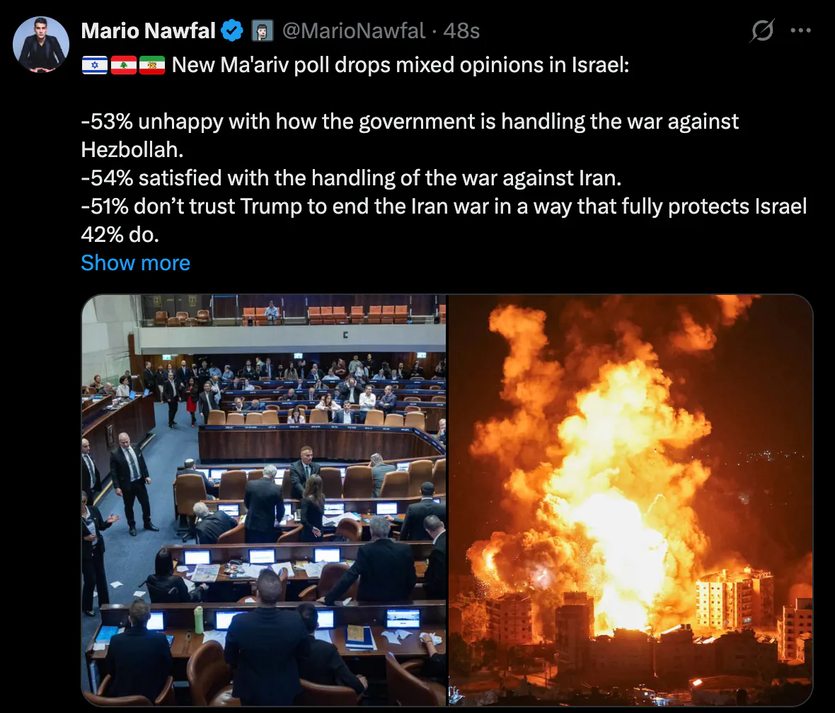 마리브 여론조사 기관이 최신 여론조사 결과를 공개했다. 이스라엘 국민의 의견이 극도로 분열돼 있음을 보여준다.- 헤즈볼라 대응 방식: 불만 53%- 이란전 대응 방식: 만족 54%- 트럼프 신뢰도: 이스라엘을 완전히 보호하며 이란전을 마칠 것이라는 신뢰 42%, 회의 51%결국 이스라엘 국민의 여론이 정확히 반으로 나뉜 형국이다.출처: 예루살렘 포스트