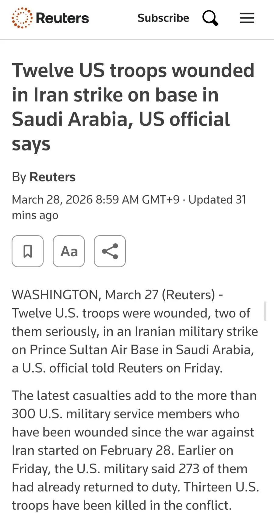 사우디에 배치된 미 공군기지가 이란군의 기습공격을 받았다고 한다. 로이터의 보도에 따르면 미군 12명이 피해를 입었으며, 그 중에서 2명이 중상을 당했다고 한다. 또한 공중급유기를 비롯한 항공기 3대가 타격을 입었는데, 항공기 값만 생각해도 엄청난 손실이 될 것으로 보인다.