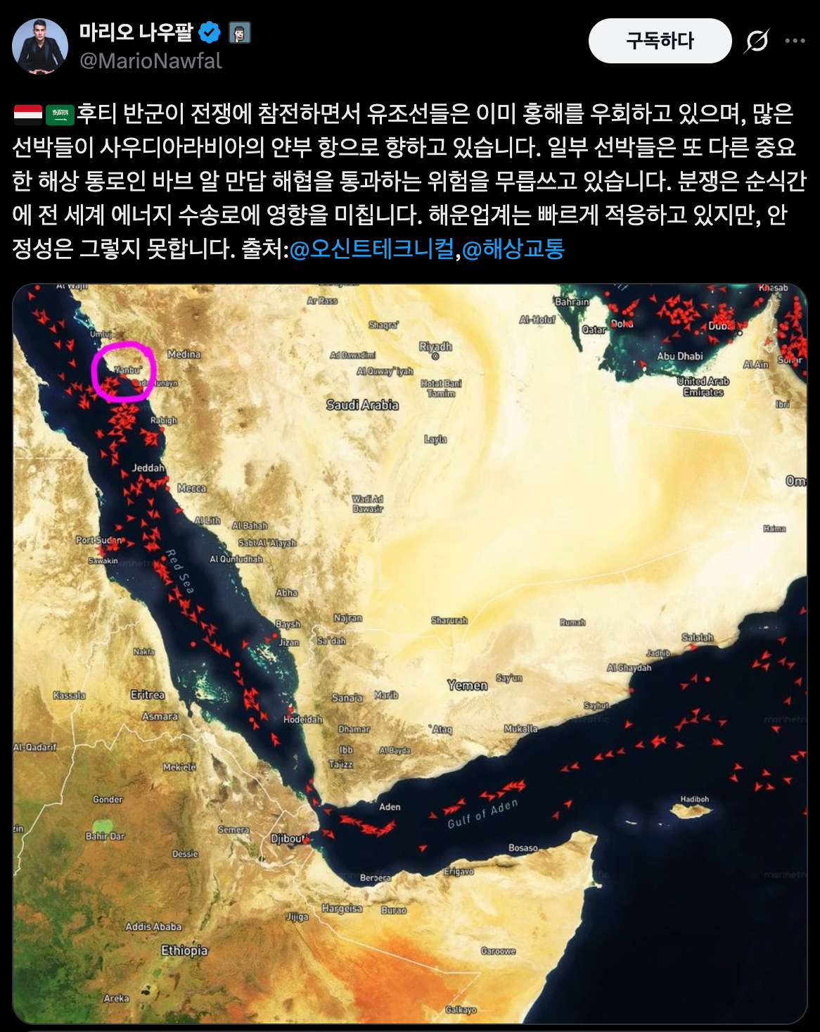 유조선들이 홍해를 우회하기 시작.WTI 100달러 터치 직전