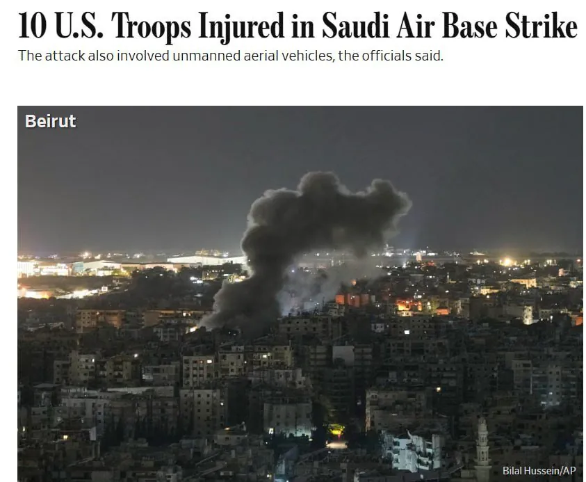 사우디아라비아의 술탄 프린스 공군 기지가 이란의 무인기 공격을 받으면서 미군이 상당한 피해를 입었습니다. 공격으로 인해 공중급유기 3대가 파손되었고, 약 10명의 미군이 부상당했으며 이 중 2명은 중상 상태라고 합니다.
