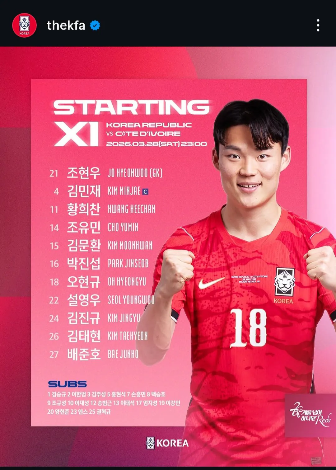 한국 라인업 공개됐는데 손흥민 벤치네?