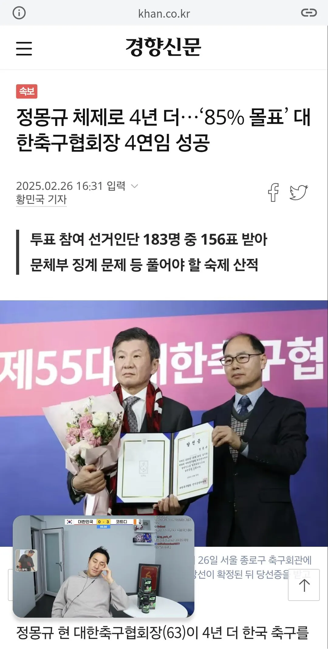 한국축구협회장 정몽구가 축구 관계자들의 투표에서 85% 이상의 지지율을 얻어 4번째 임기를 확보하게 됐다. 축구계 인사들로부터 광범위한 신뢰를 받은 것으로 평가된다.