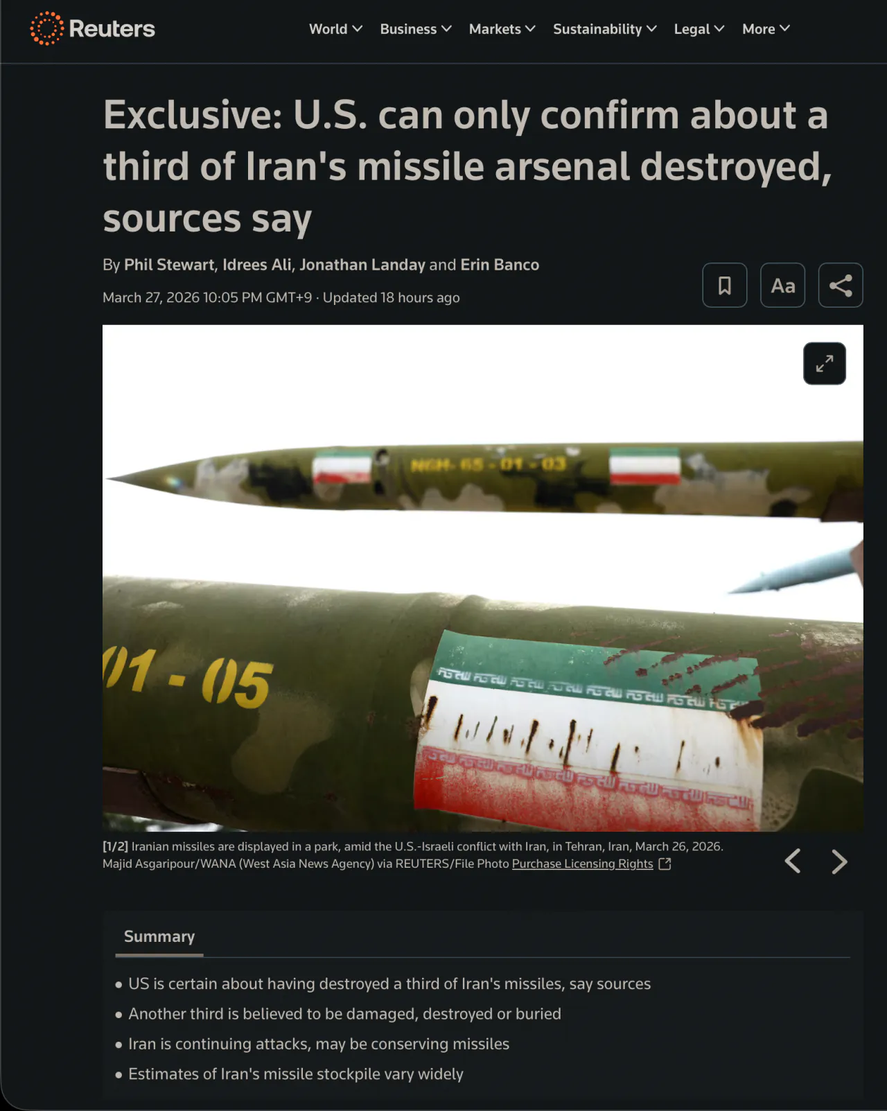 미국 정보기관이 한 달 넘게 이란 공격을 진행하고 있지만, 이란의 미사일 저장소 중 확실하게 없앤 것은 겨우 3분의 1 정도라고 평가했다.나머지 3분의 1은 상황이 불명확한 상태다. 폭격으로 파괴되었을 수도 있고, 지하 벙커나 갱도에 안전히 보관되어 있을 수도 있다는 의미다.무인기 전력도 비슷한 수준으로, 약 3분의 1만 제거된 것으로 파악되고 있다.