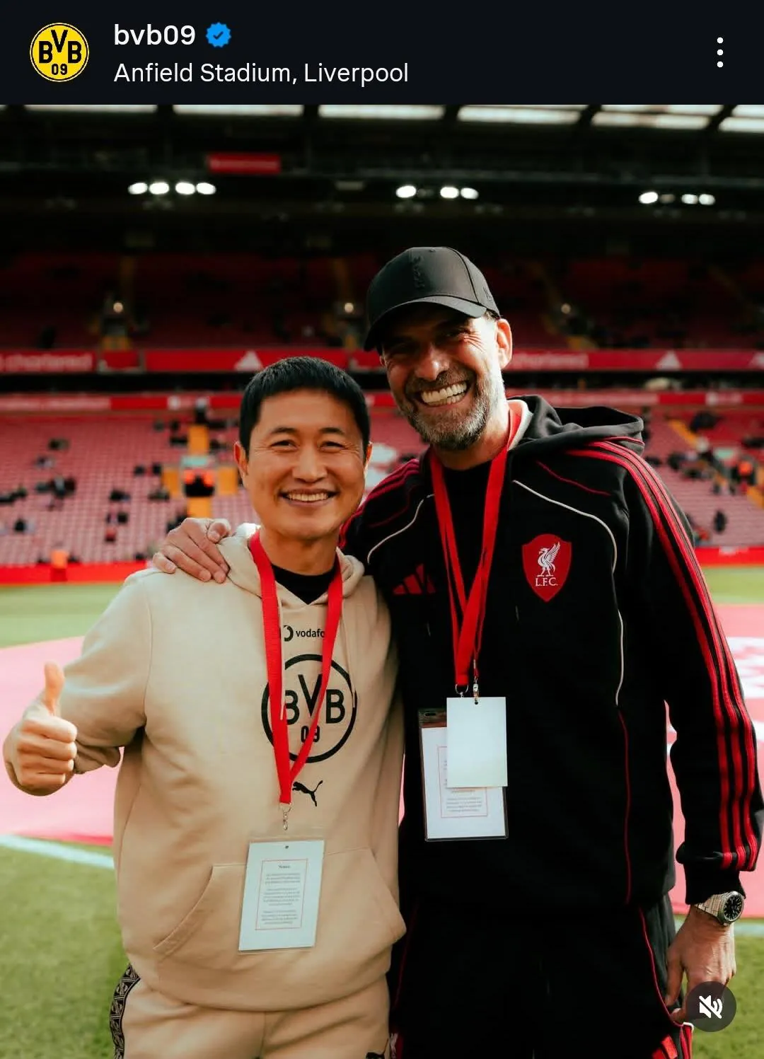 리버풀 레전드 팀(티아고, 크라우치, 제라드, 두덱, 카윗, 레이나 등)을 상대로 도르트문트 레전드팀이 경기 진행 중인데, 이영표가 교체 선수 명단으로 나중 투입을 기다리고 있다고 함