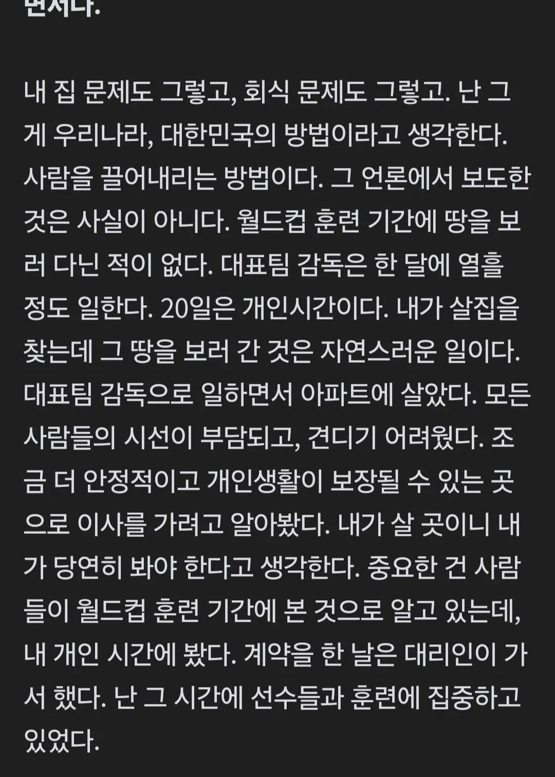2014 브라질 월드컵 당시 홍명보는 '대표팀 감독은 열흘 일하고 20일은 개인시간'이라고 발언했다.