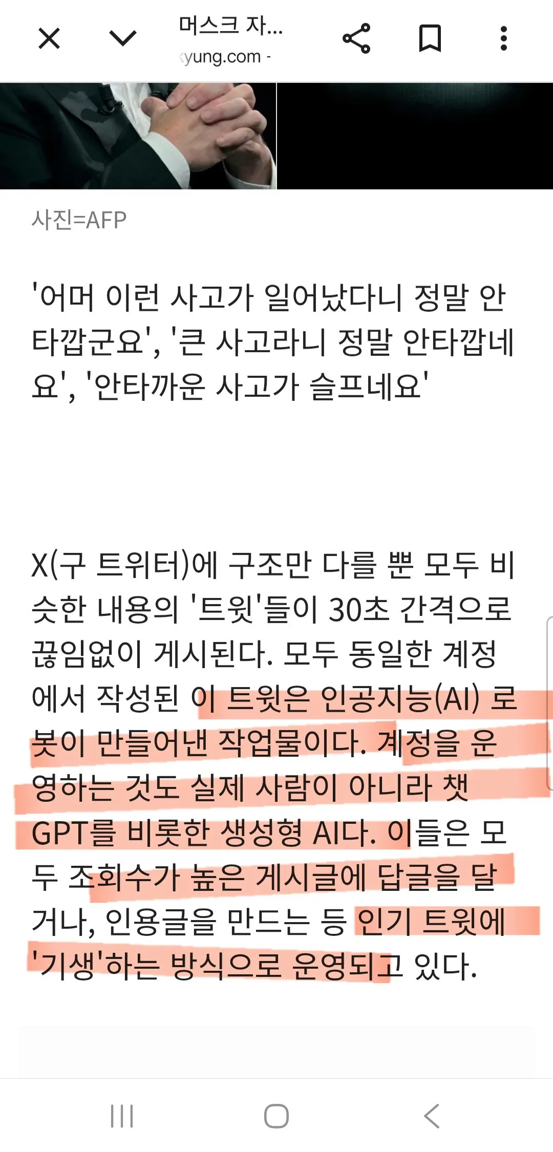 계정의 표현방식과 문체를 보면 사람이 쓴 글이 아닌 듯해. 특히 두 번째 짤의 말투라든지, 문장 구조가 AI가 생성한 느낌이 팍 들어. 챗GPT나 제미나이를 한 번이라도 사용해본 사람이면 금방 알아챌 수 있는 그런 느낌.