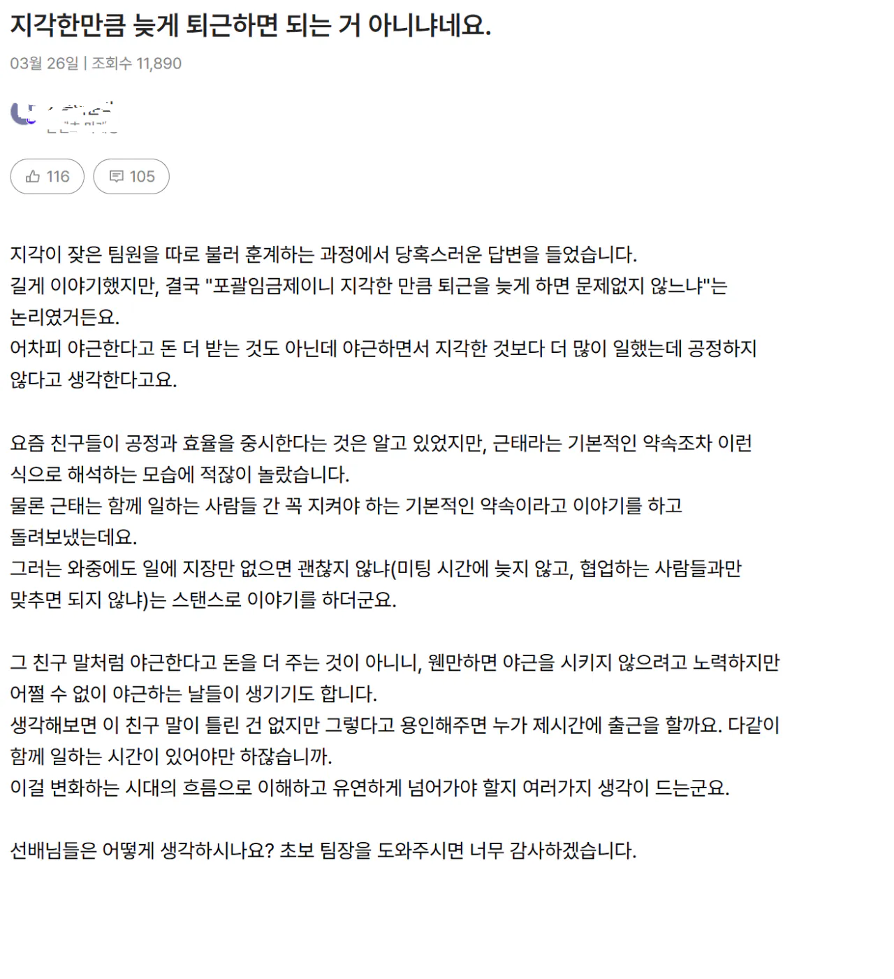 지각을 지적받은 팀원의 대답이 걸렸다고 함."어차피 급여는 정해져 있으니 늦게 들어온 만큼 늦게 나가면 되지 않냐?"팀장도 논리적으로 완전히 반박하기 어려워서 난감한 상황.댓글 반응은 나뉨. 직장의 기본 규칙을 지켜야 한다는 입장과 정해진 급여제를 악용하는 회사 문화가 근본 문제라는 의견이 팽팽함.
