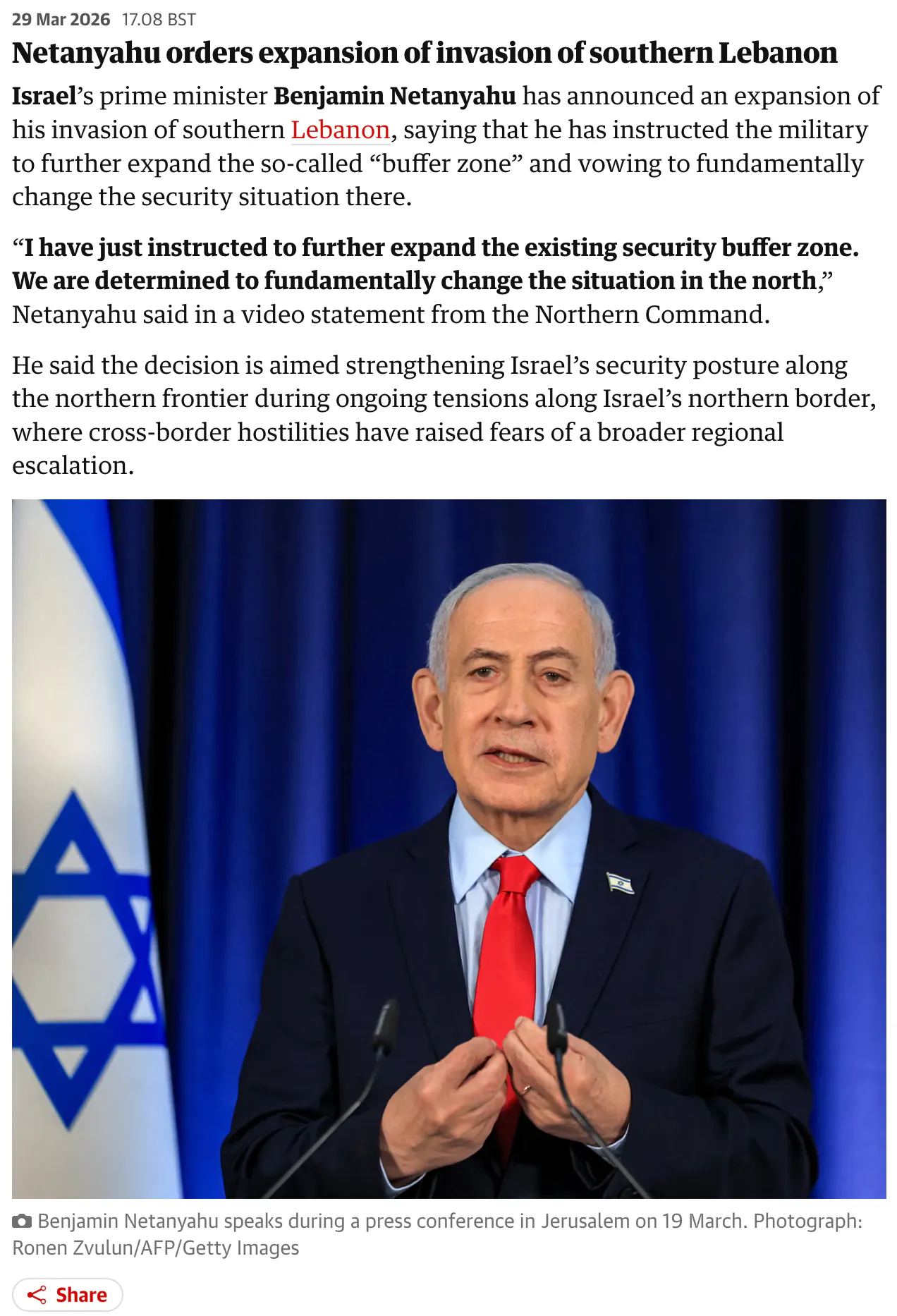 가디언 보도에 따르면 이스라엘의 베냐민 네타냐우 총리가 레바논 남부 지역에 대한 군 작전을 확대하겠다고 공식 발표했습니다. 북부 군사령부를 통해 전한 성명에서 그는 국경 인근 완충지대를 더욱 넓힐 것을 군에 지시했으며, 이스라엘 북부의 보안 환경을 획기적으로 개선하겠다고 밝혔습니다. 네타냐우 총리는 "이미 기존 보안 완충지대의 범위를 더욱 확장하도록 명령했으며, 우리는 북부 지역의 현황을 근본적으로 개선할 것을 다짐한다"고 강조했습니다.