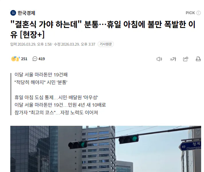 서울 120다산콜센터의 통계를 보면 마라톤으로 인한 교통 민원이 급격히 늘어났다. 2021년 40건에 불과하던 민원이 2025년 10월에는 411건으로 4년 사이 10배를 넘어섰다. 경찰에 접수된 민원도 2건에서 20건으로 크게 증가했다.