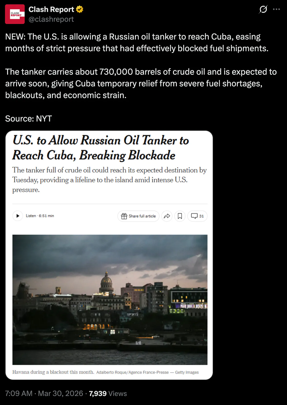 미국이 러시아 유조선의 쿠바 입항을 승인했다고 한다. 그동안 미국이 쿠바로의 연료 공급을 끊어온 점을 고려하면 상당히 예상 밖의 결정이다. 이 유조선에는 약 73만 배럴의 원유가 실려 있으며 곧 쿠바에 도착할 것으로 예상된다. 최근 쿠바는 심각한 연료 부족으로 정전이 반복되고 경제 상황도 악화되고 있었기에, 이번 공급이 상황 개선에 도움이 될 것으로 전망된다. 미국의 오래된 쿠바 제재 정책이 조금씩 완화되고 있는 것으로 보이며, 이로 인해 쿠바의 에너지 위기가 어느 정도 해소될 여지가 생겼다.