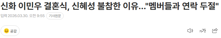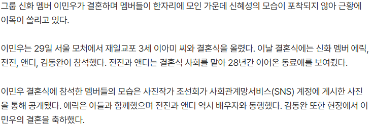 신화의 멤버 이민우 결혼식이 있었지만, 같은 팀에서 활동했던 신혜성은 자리에 오지 않았다. 신혜성이 중요한 행사를 건너뛴 이유는 신화 내 멤버들 간 연락이 완전히 끊어져있었다는 점이 밝혀졌다. 서로 소식을 나누지 못한 상태가 오래 지속되면서, 결혼이라는 큰 순간도 함께 나누지 못한 것으로 보인다.