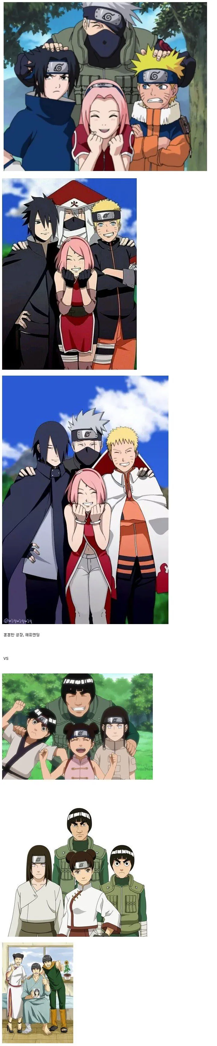 카카시팀- 카카시는 6대 호카게 출신이고 나루토는 7대 호카게- 사스케는 7대 호카게의 숙명의 라이벌이면서도 진짜 친구- 사쿠라는 5대 호카게를 도와주고 지금은 의사로 활약 중가이팀- 가이는 신체장애, 텐텐은 아직도 못 시집- 네지는 벌써 죽고, 록리는 머리가 자꾸 빠짐