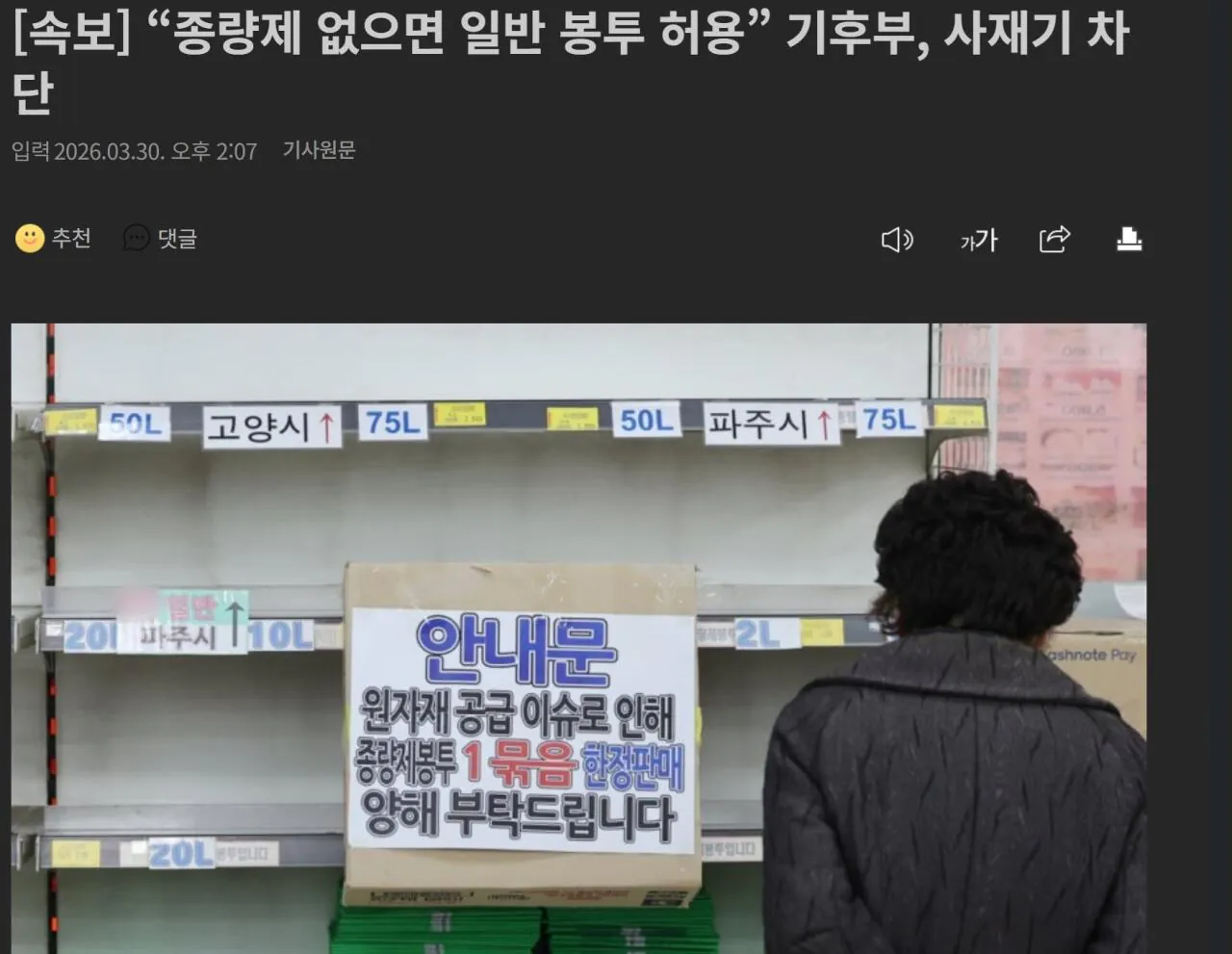 30일 김성환 기후부 장관은 자신의 페이스북에 글을 통해 “최악의 상황이 오면 일반 봉투 사용 허용 등 만반의 대책을 세웠다”면서 “집에 쓰레기를 쌓아둘 일은 절대 없다”고 강조했다.
