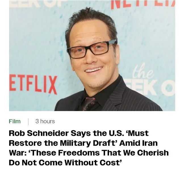 배우 롭 슈나이더가 SNS에 올린 게시물에서 현재의 이란 전쟁 상황을 언급하며 미국의 징병 체계 부활을 주장했다. 그의 주장은 18세 이상의 모든 미국인이 2년간 군복무를 의무적으로 해야 한다는 내용이다. (다만 슈나이더는 본인 군 경험이 없음) 그는 이 기간을 해외나 국내의 자원봉사 활동으로도 충당할 수 있다는 대안을 제안했다. 슈나이더는 미국 시민이 누릴 수 있는 자유와 기회의 소중함을 언급하면서, 이러한 혜택들이 결코 무상으로 주어지는 것이 아니며 일정한 책임이 따른다고 강조했다.