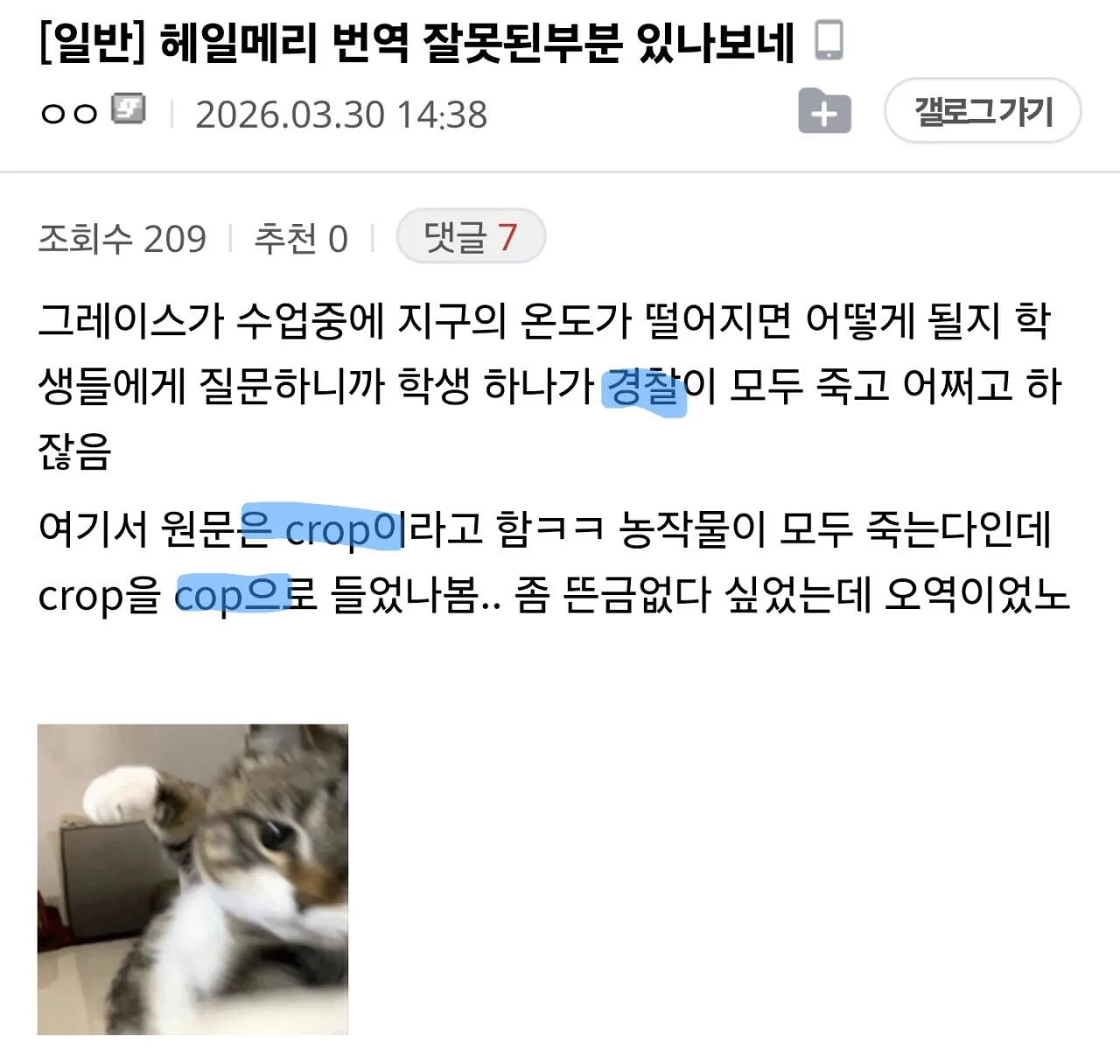 첫 번째, crop 부분. 원문은 농작물인데 경찰(cop)로 번역했더라. 단순 착각 같음.