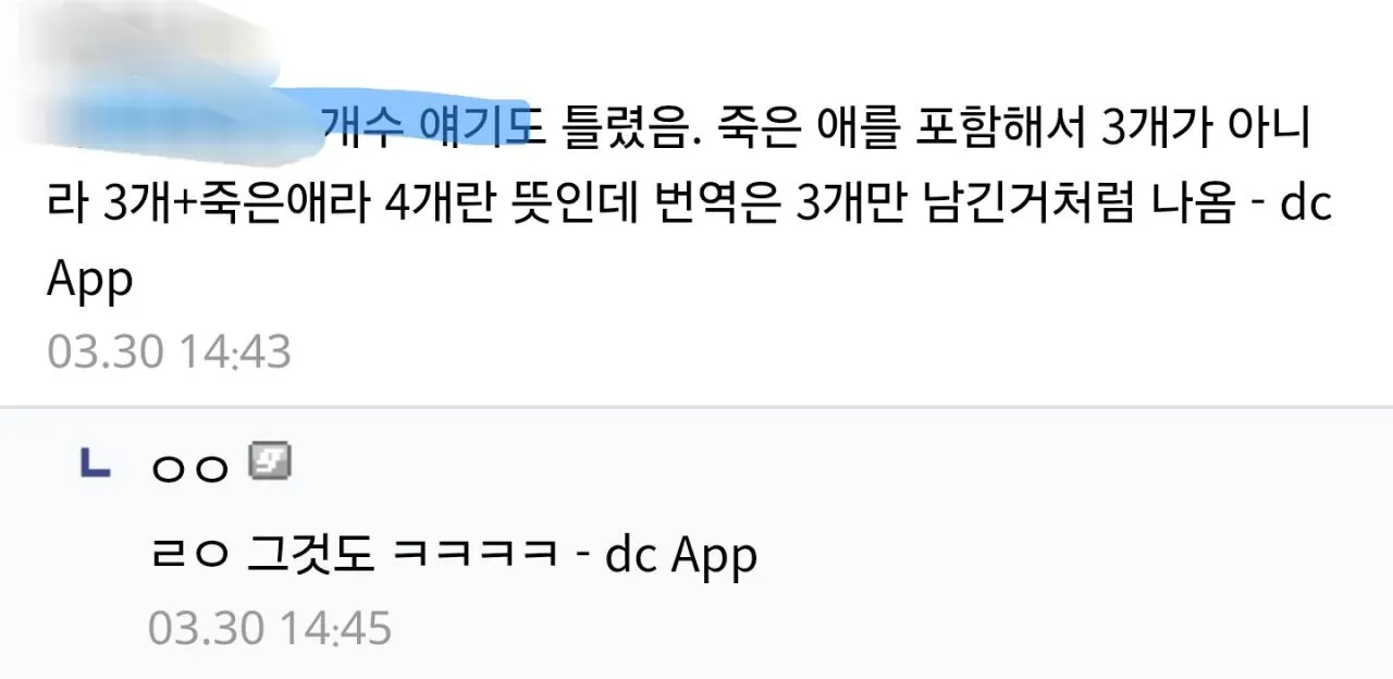 두 번째, 개수 표현. 정역에선 죽은 것 포함 4개, 제외 3개로 나뉘는데 번역본은 죽은 것 포함 3개로 통일되어 있음. 뭔가 빠진 느낌.