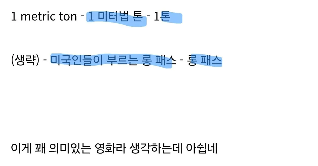 세 번째, metric ton 표기. 정역은 미터법 톤, 번역본은 그냥 톤이라고 했는데, 사실 톤의 종류가 3가지(숏 톤, 롱 톤, 미터법 톤)라서 구분이 중요함. 미국인들은 미터법 톤을 안 쓰고 있는데 작중에선 미터법 톤을 쓰거든.