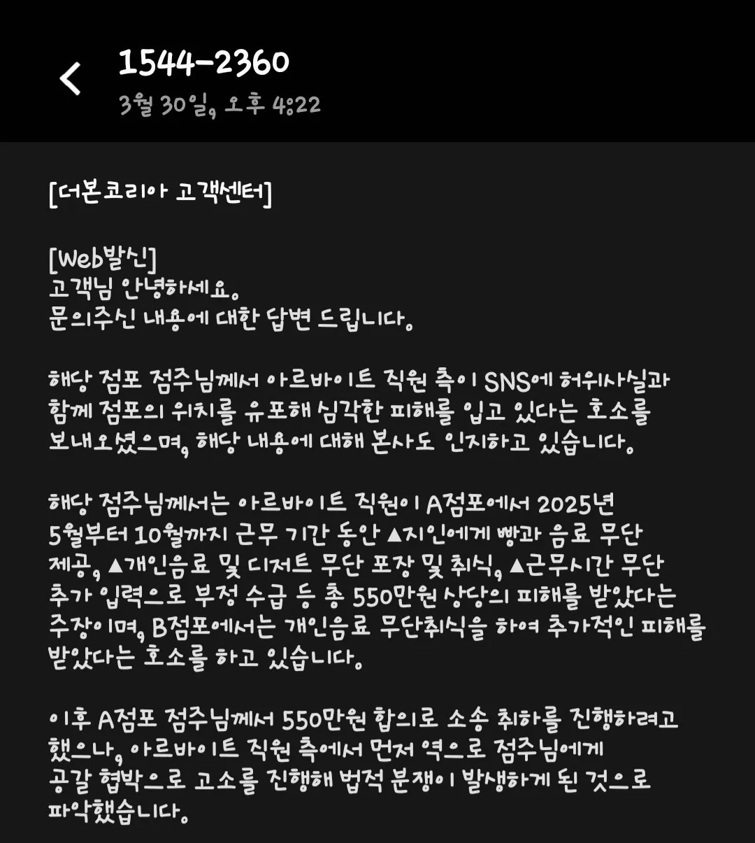 청주 빽다방 알바 이슈에 대해 포텐글이랑 유튜브에서 본 내용들이 맞는지 궁금해서 본사로 문의했다.오늘 문자로 답변을 받았는데, 점주 쪽에서 주장하는 것과는 완전히 다르더라.정말로 뭔가 숨겨진 게 있는 건가 싶다.