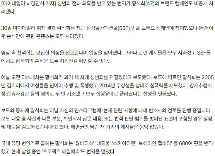 성범죄 전과 논란을 빚고 있는 황석희가 참여한 빈폴 광고 게시물이 삭제된 것으로 알려졌다.